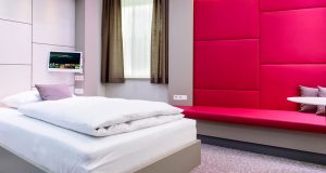 Die Linienstruktur erscheint wie ein Relief in der Oberfläche und erzielt so einen spannenden 3D-Effekt. Dabei wirken die Flächen innerhalb der Linien farblich lebendig und rau, wie die Unregelmäßigkeiten bei echten Schieferplatten. Die über mehrere Paneele verlaufenden Linien stellten eine Herausforderung dar, denn sie mussten durchgängig wirken, obwohl die Außenfolie auf dem zunächst planen Verbundmaterial aufkaschiert und dann allseitig abgekantet wurde.